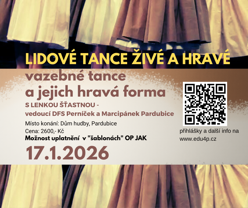 Cílová skupina: Seminář je určený pro všechny taneční pedagogy, kteří si chtějí zopakovat české lidové tance ať už jako zdroj inspirace k tvorbě, pro potřeby běžné výuky či přímo pro práci folklorních souborů.